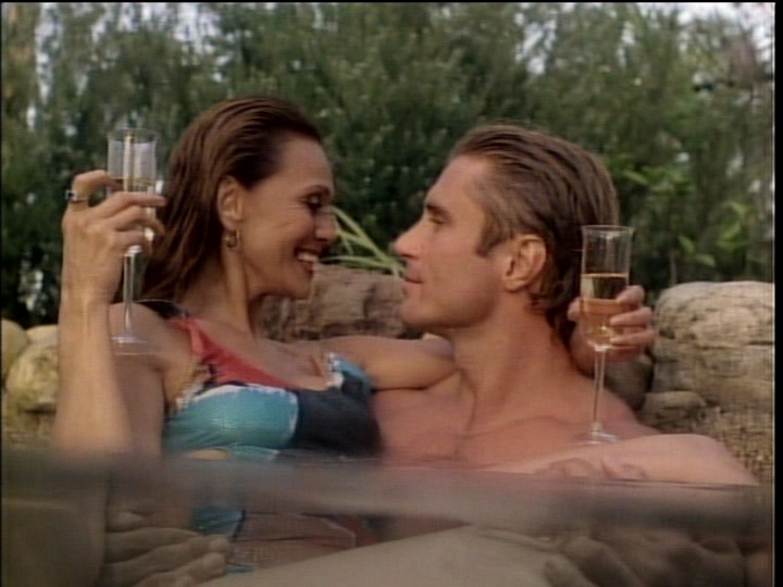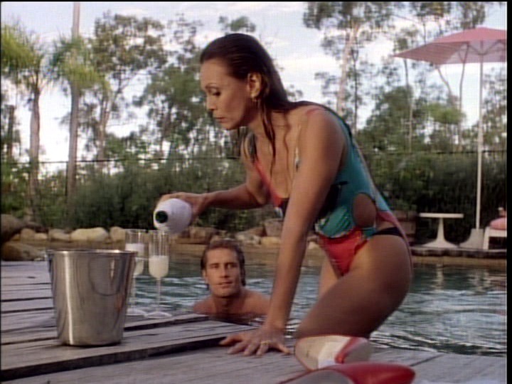 Acker calls Phelps and tells him that woman number two, Marilyn (Paula Goodman), is going to meet him at the Saint Mark Hotel. Acker listened to Marilyn's answering machine (she lives in Oregon) where Phelps left his phone number of 555-6262 (kind of a dumb move) and convinced her to meet him (actually Acker) at the hotel. Acker in disguise as Phelps garrotes Marilyn who falls in a pool as horrified hotel guests look on. When the real Phelps shows up a few minutes later, everyone points him out to the cops as the killer, and he narrowly escapes.